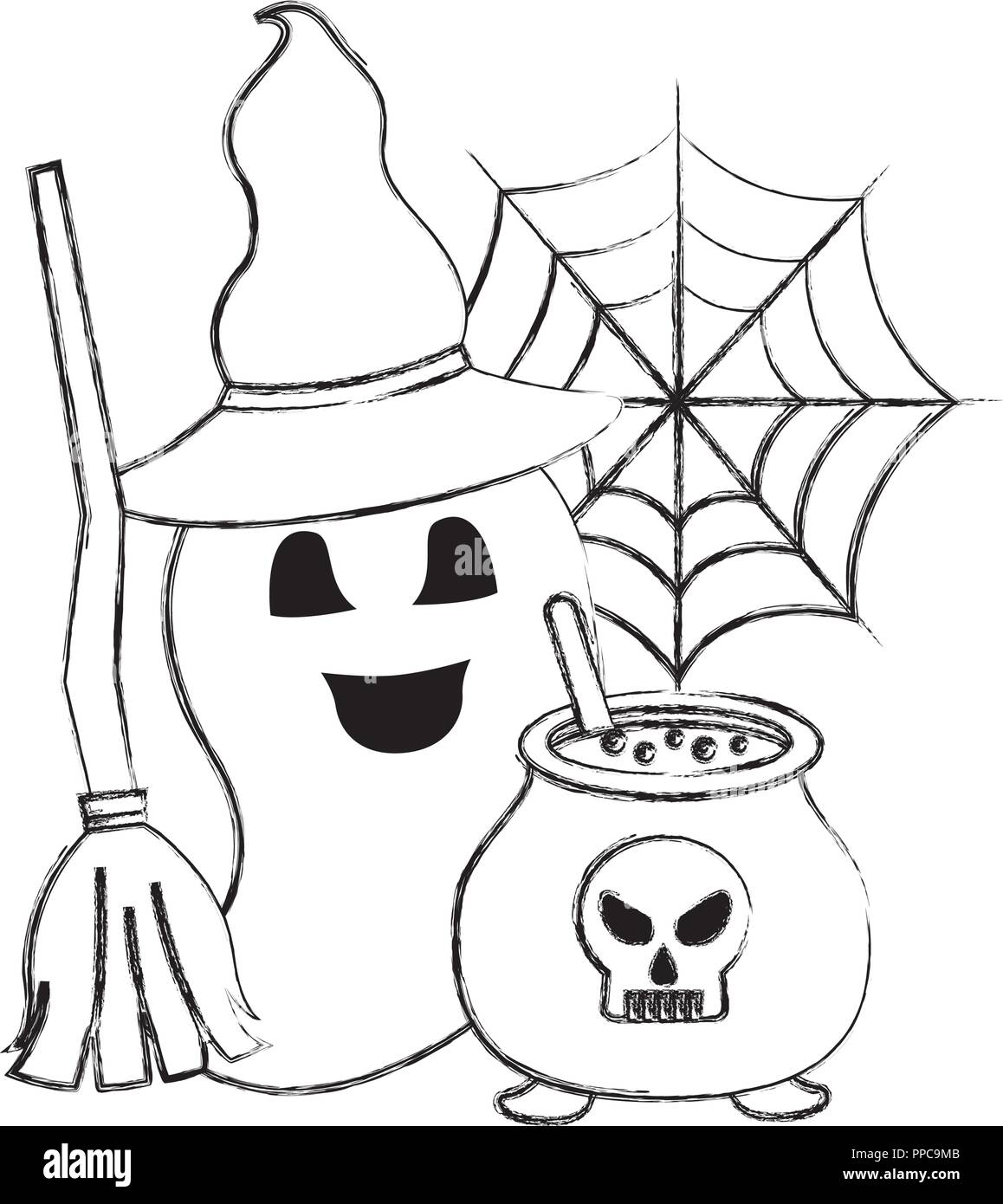 Halloween Ghost With Hat And Broom Cauldron Vector Illustration Hand Drawing Royalty Free Svg Cliparts Vectors And Stock Illustration Image 109824230